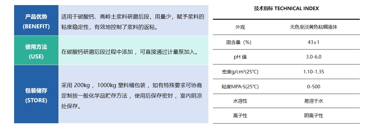 HQ-S933M 分散劑,可與水任意比例互溶,提高碳酸鈣和高嶺土研磨后段料 漿的穩(wěn)定性。